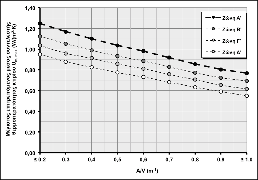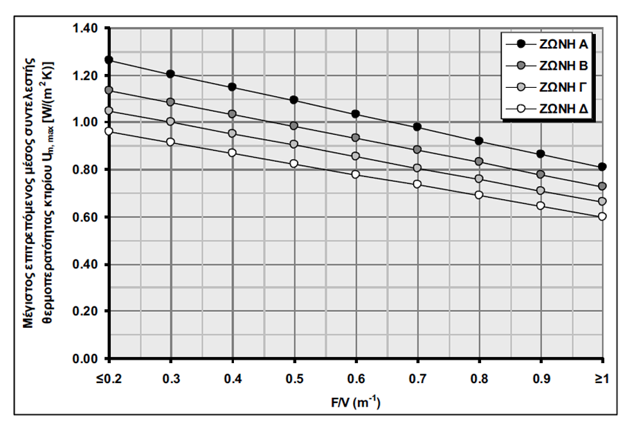 Πίνακας 3.3.β (TOTEE-20701-1). Μέγιστες επιτρεπόμενες τιμές του μέσου συντελεστή θερμοπερατότητας ενός κτηρίου ανά κλιματική ζώνη συναρτήσει του λόγου της περιβάλλουσας επιφάνειας του κτηρίου προς τον όγκο του σε περίπτωση ανέγερσης νέου κτηρίου.